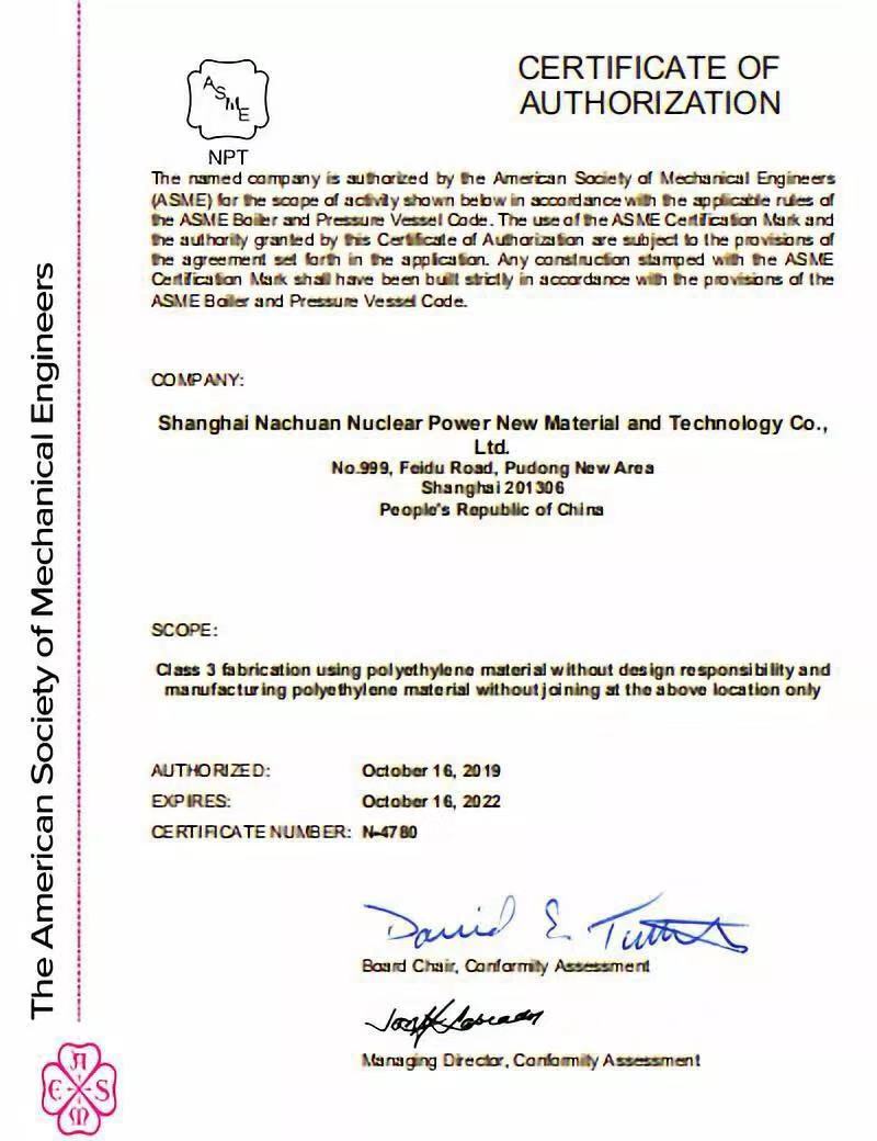 作為國內領先的高新科技環保產業集團,納川股份以技術創新、商業模式創新、管理與機制創新為三大引擎,在高端管材領域和智慧管網建設方面不斷取得重大突破,擁有專利超200項。2018年,納川生產的“核級高密度聚乙烯(HDPE)管道”通過中國核能行業協會的科技成果鑒定,鑒定成果實現“雙首創”。2019年1月,納川研發出適合深海鋪設的3.3米超大口徑HDPE塑料管并成功安裝。納川成為為數不多具備生產和服務超大口徑塑料管材能力的企業。2019年6月,納川股份旗下子公司上海納川取得美國ASME協會核3級授權證書(NPT),成為全球首家獲得此項許可的HDPE管道生產企業。