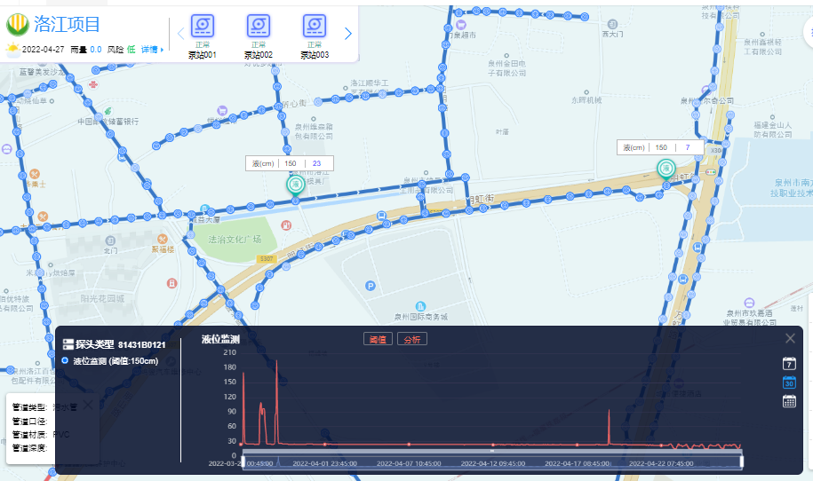 疫情期間,受防控政策影響,在人員無法實地巡查的情況下,利用平臺的監(jiān)測數(shù)據(jù)化分析,實現(xiàn)疫情期間運維監(jiān)測不停工,在疫情期間充分發(fā)揮了智慧水務(wù)平臺對管網(wǎng)設(shè)施安全的預(yù)警功能,有效提高特殊時期的應(yīng)急能力。防控結(jié)束后根據(jù)平臺監(jiān)測數(shù)據(jù)分析,可快速、精準(zhǔn)開展管道缺陷處置工作,這大大提升了管線的安全系數(shù),高度體現(xiàn)了智慧水務(wù)平臺的安全保障功能。