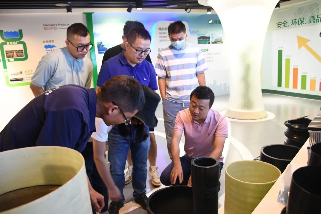 游先輝總經理一行參觀了納川股份總部展廳,納川股份能源交通國際事業部總監嚴立威介紹了公司發展歷程、企業文化、獲得榮譽,對公司高密度聚乙烯(HDPE)纏繞結構壁管、鋼骨架聚乙烯(PE)塑料復合管、聚酯增強復合頂管等產品進行講解。