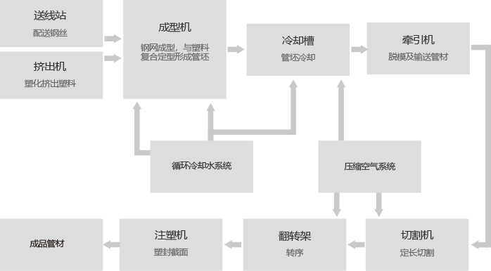 鋼骨架聚乙烯塑料復合管采用連續(xù)纏繞、焊接成鋼網骨架,塑料熔融擠出與骨架同步復合成型工藝。即以優(yōu)質低碳鋼絲為增強相,聚乙烯(PE)為基體,通過成型機將鋼絲焊接成網,與熔融聚乙烯在復合機頭內進行復合擠出,在生產線上連續(xù)復合成型,經冷卻、牽引切割、封口,得到直管成品。